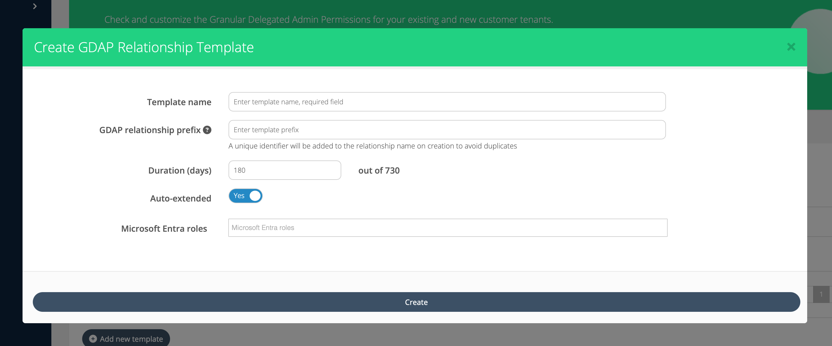GDAP relationship prefix - will be used to populate the relationship name in the GDAP request later on when you use the template to create a new request. By adding a prefix to your template you will have an easier time identifying any relationship created using the template later on, as well as describing the purpose of the request.