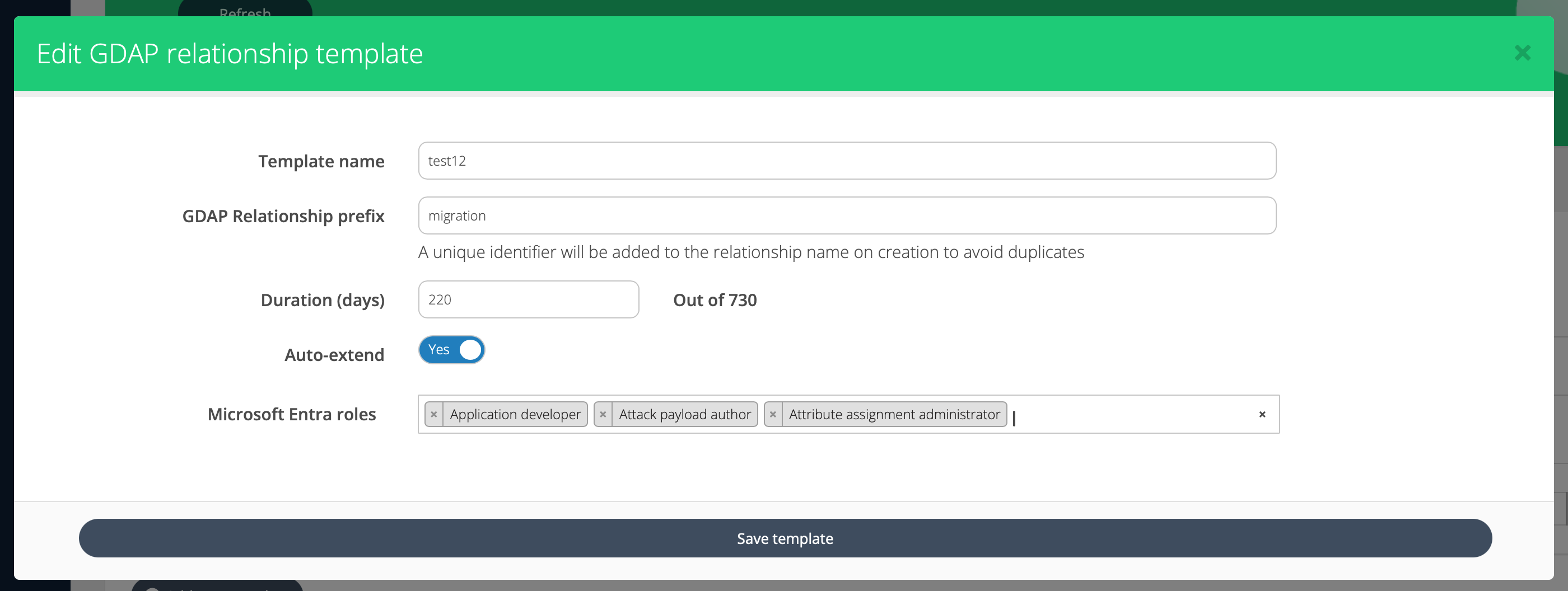 Microsoft Entra roles - lets you define what roles to include in requests based on the template.